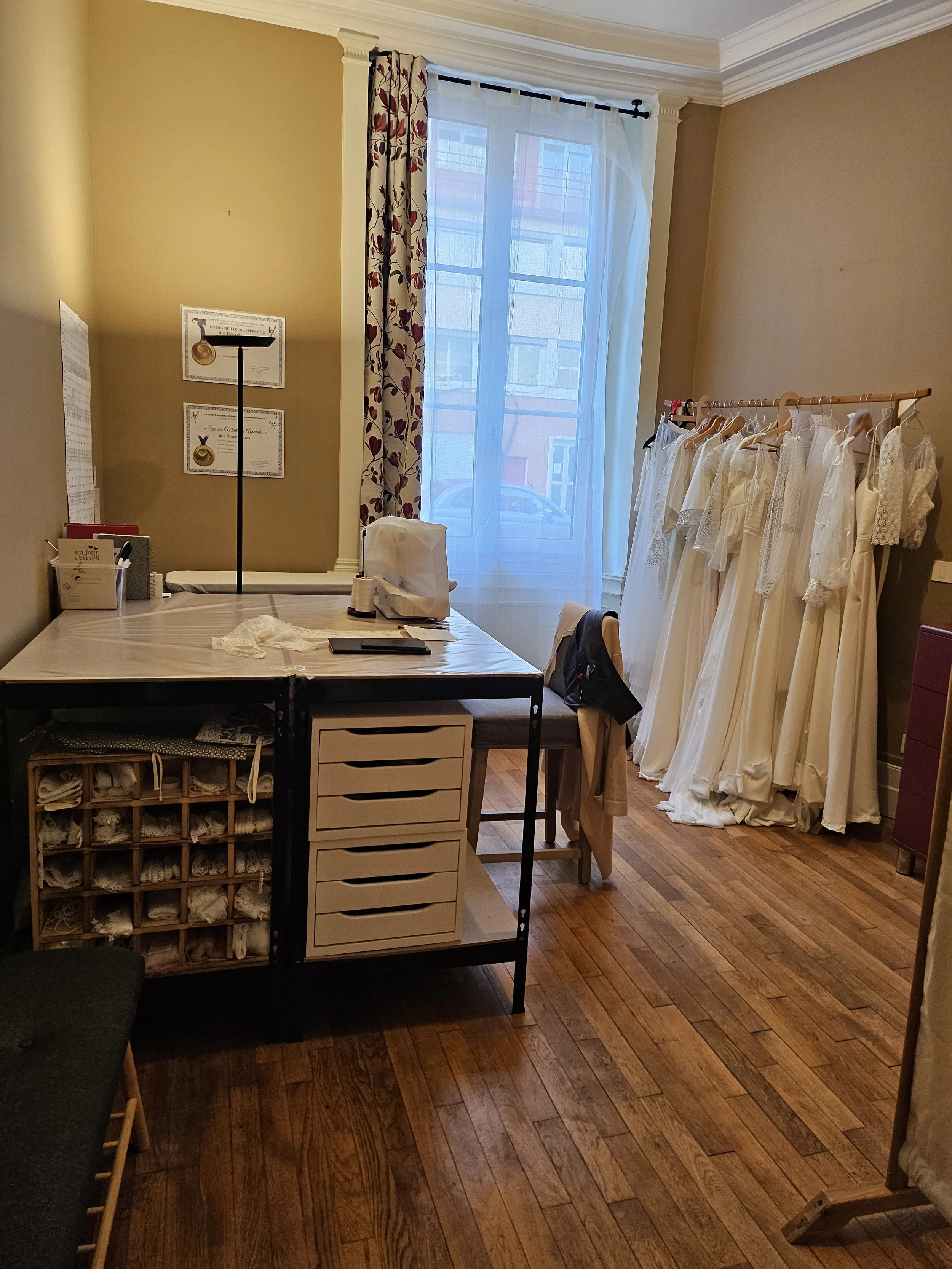 L’atelier de couture Un jour c'est oui, c'est le coeur battant du showroom. C’est ici que l’histoire de votre robe s’écrit. Vous y retrouverez, pas seulement une machine à coudre et une table de coupe, mais aussi un métier à broder, des échantillons de dentelles de motifs divers et variés, de galons, du tulle fin…
